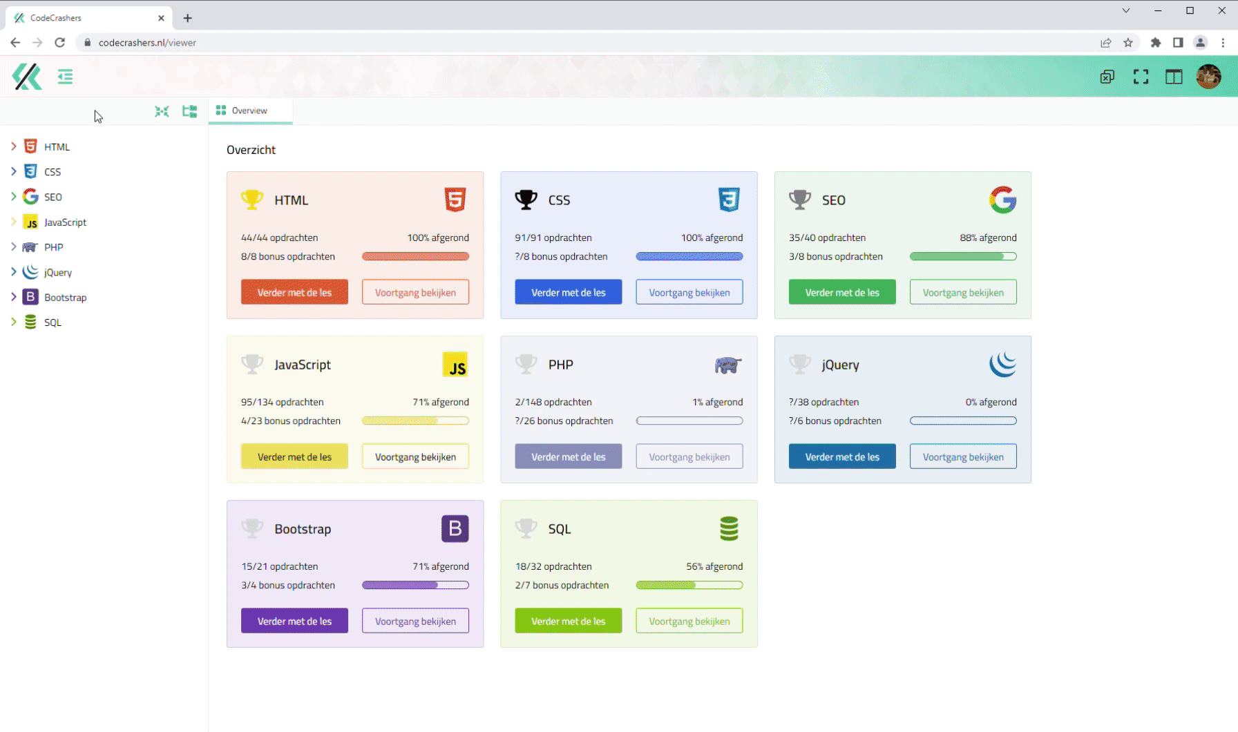 Bij CodeCrashers zijn wij van mening dat de beste manier om lesmateriaal over webdevelopment aan te bieden... via een online webapplicatie is! Om die reden hebben wij een team van ervaren Front-end en Back-end developers verzameld om een digitale leeromgeving te bouwen waarin alle onze lessen gehuisvest zijn.